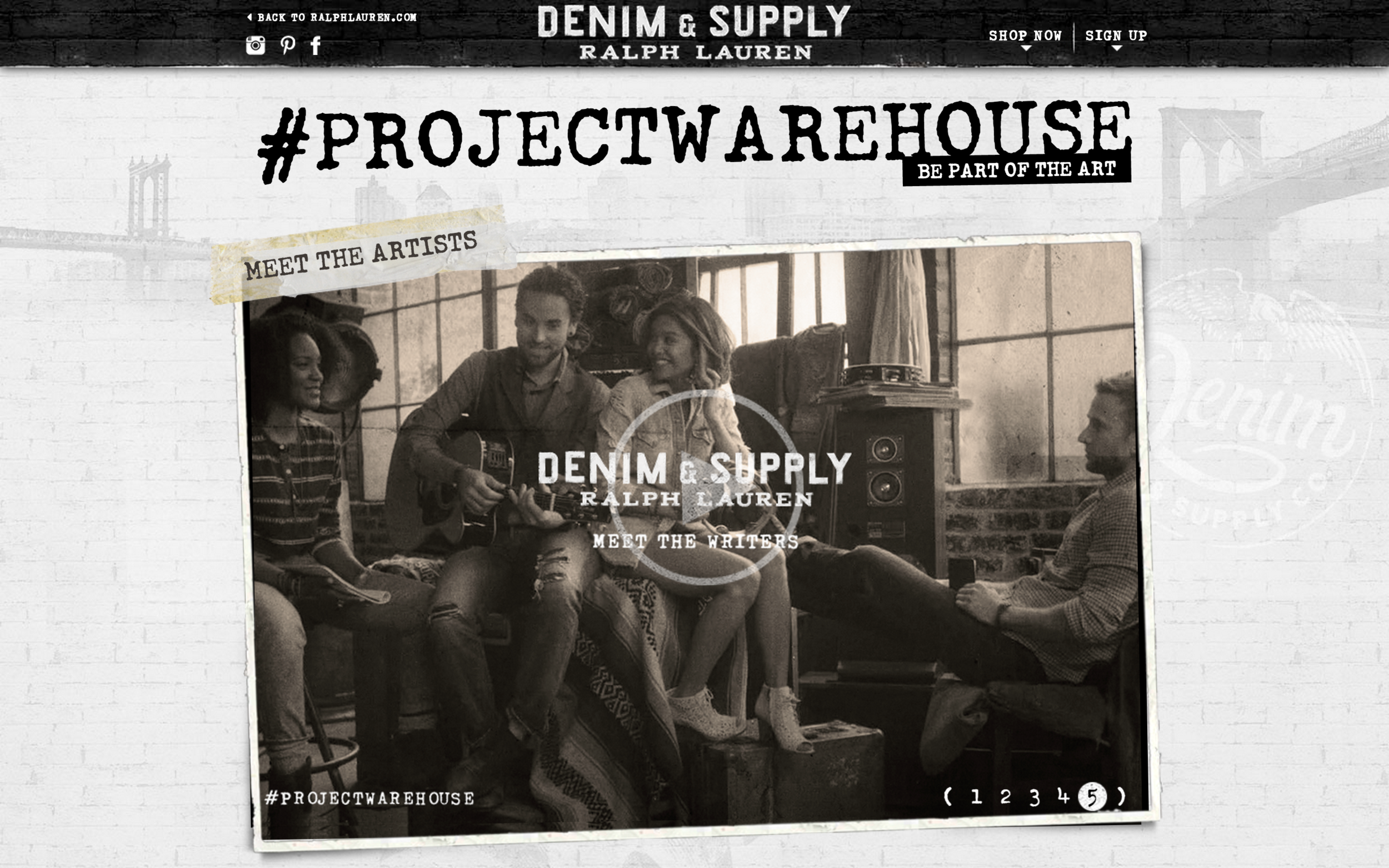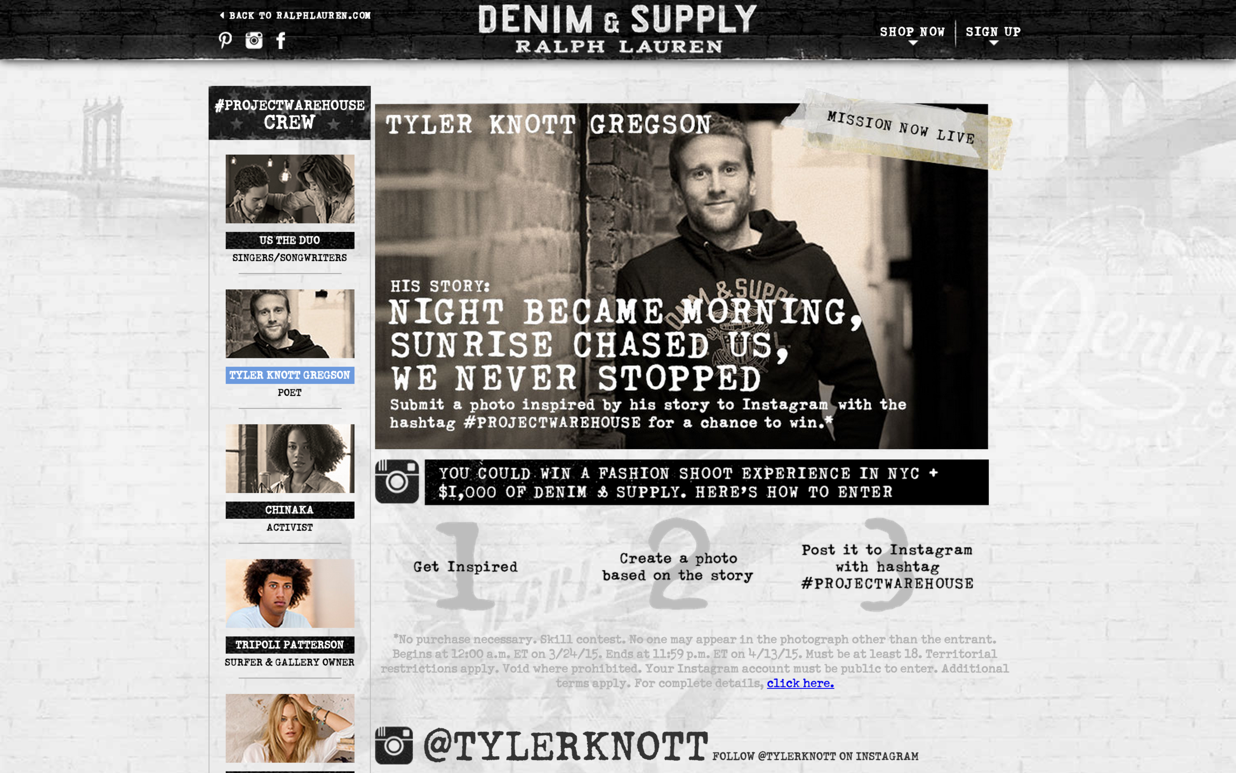 To help engage Ralph Lauren's millennial demographic through the Denim & Supply brand, our team at Mekanism created an Instagram based contest platform called #projectwarehouse where the brand collaborates with artists, designers, and writers to create unique works inspired by specific collections.